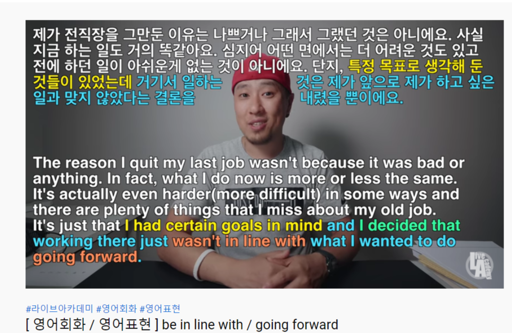 이 영어예문을 유튜브에서 찾아보니 '라이브아카데미' 에 아래 표현이 들어간 예문소개영상이 올라와 있는데요. 전 직장을 그만둔 이유를 말하면서 'GOING FORWARD'를 사용하고 있어요.