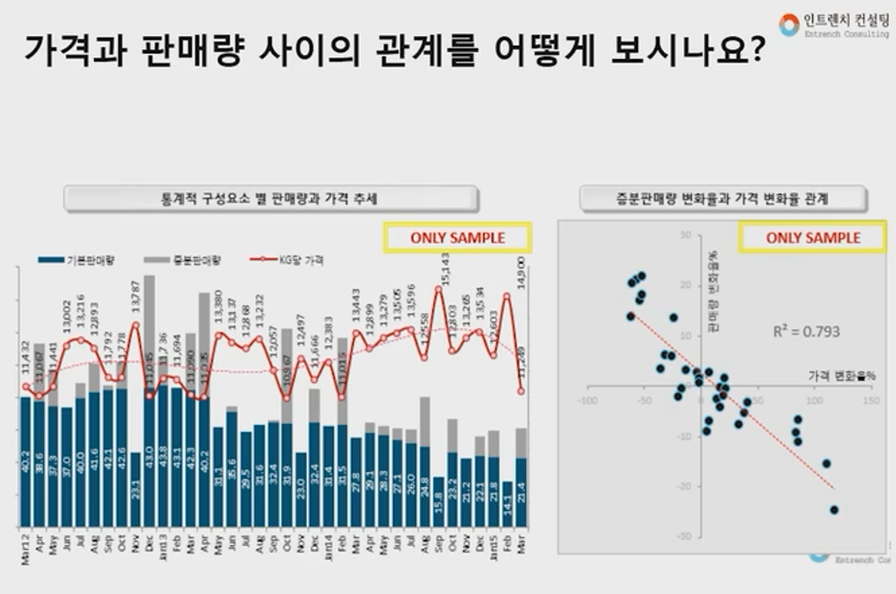 아이스크림판매량과 팥빙수의 여름철 판매량이 같이 올라간다면 그들의 관계는? 팥빙수가 많이 팔린다고 아이스크림의 판매가 올라가지는 않는다. 인과관계가 아닌 상과관계의 관계. 가격과 판매량과 같이 원인과 결과가 나오는것은 회귀분석. 만약에 아래와 같이 가격과 판매량사이의 관계가 있다는것을 볼때는 상관분석을 보는 것이고 얼만큼 영향이 있어? 라는것이 궁금하다면 회귀분석까지 들어가야 하는 것.