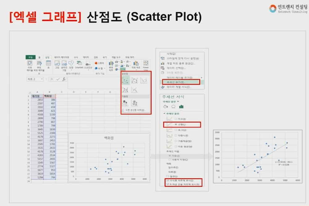 차트에 있는 산점도 그래프를 선택하여 차트화해본다. 함수를 쓰지 않고 계수를 뽑을려면 마우스오른쪽 클릭해서 추세선옵션에서 '선형'을 선택하고 수식을 차트에표시 + R-제곱값을 차트에표시를 선택한다.