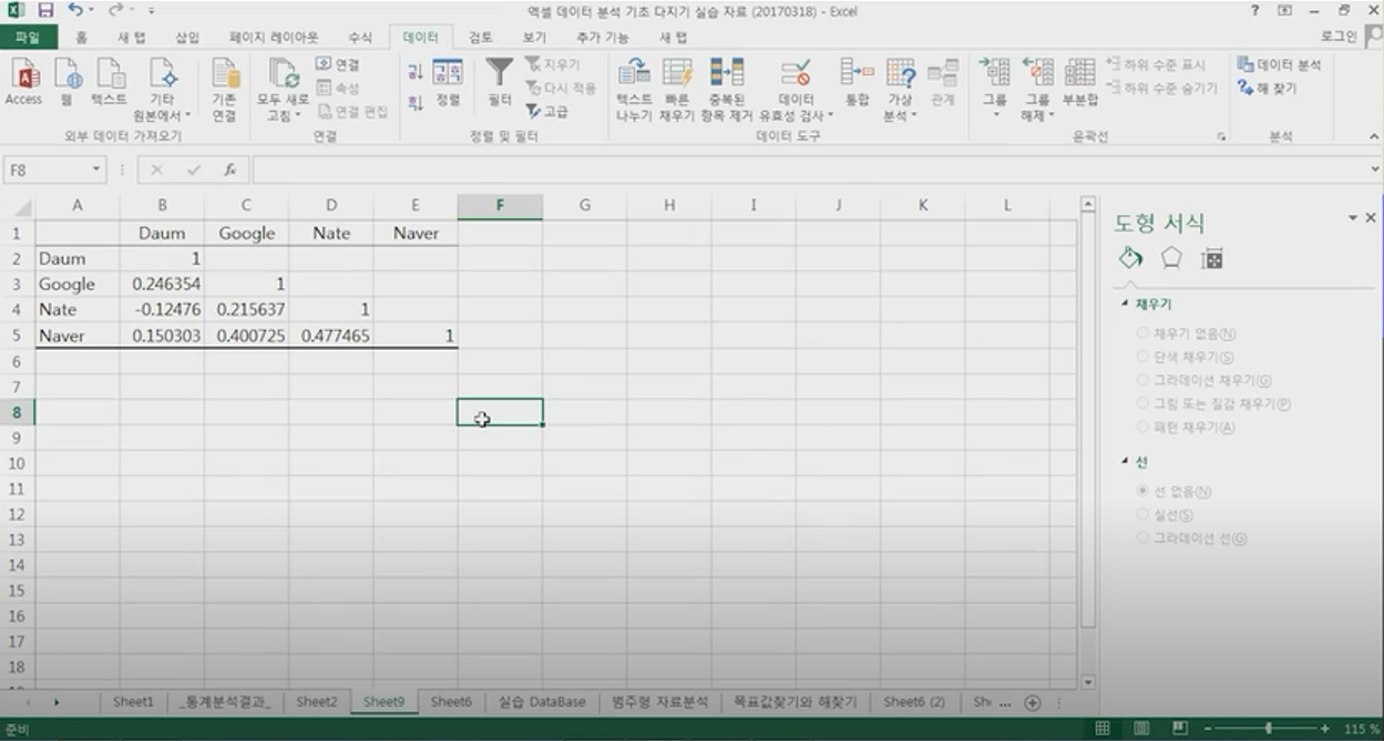 엑셀 통계데이터분석에 들어가서 '상관분석'을 클릭한다.
