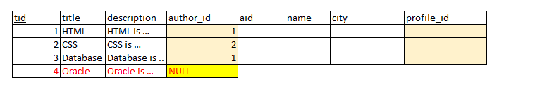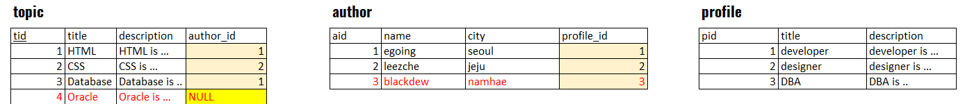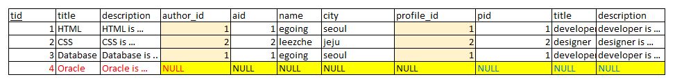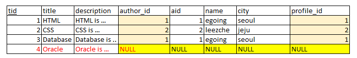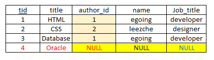 2) 그리고 author id와 topic테이블의 aid컬럼값중 동일한값을 붙인다. 그런데 아래 예시 중 Topic값중 Null에 해당하는 값은 author에 없으므로 그 옆은 Null로 표현한다.