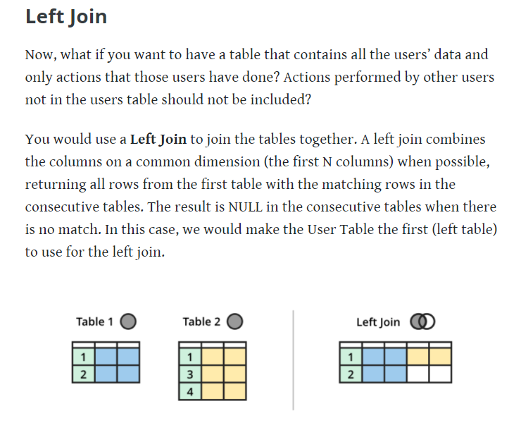 아래의 Table1과 Table2라는 두개의 테이블이 있을 때, left join은 기준이 되는 표를 왼쪽에 두고, 이 표를 기준으로 오른쪽의 표를 합성해서 하나의 표를 만드는 방법입니다. ( 생활코딩 설명 참조 ) 즉 Table1에만 있는애들도 가지고 오는 것 + Table1과 Table2공통으로 있는값을 가지고오는것입니다. Left outer join 이라고 부르기도 한다.