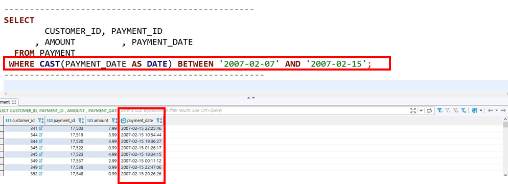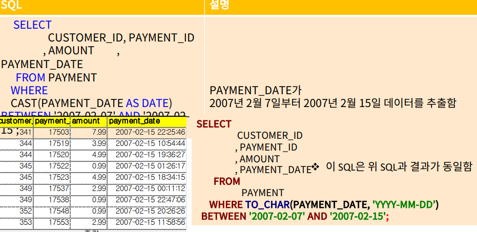 예) CAST (payment-date, DATE ) BETWEEN '2007-02-07' AND '2007-02-15'