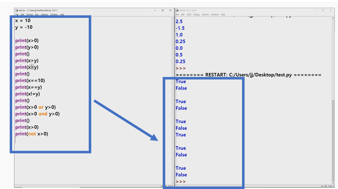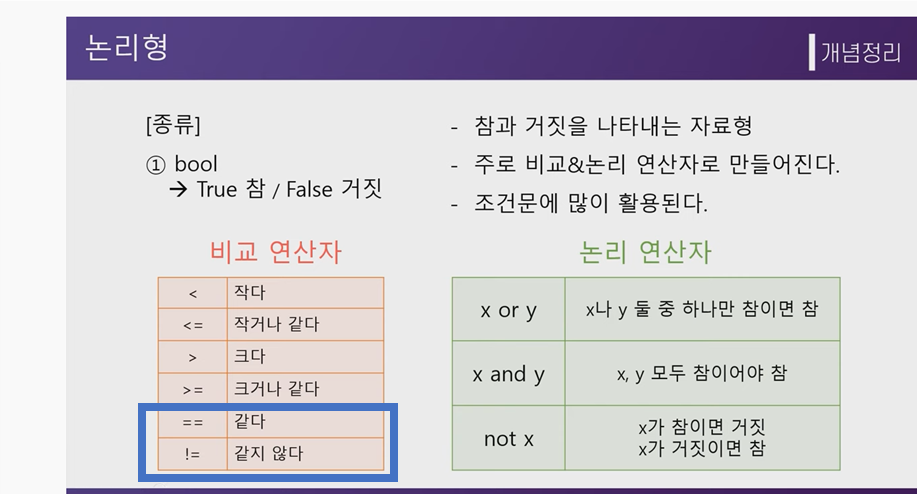 수학에서 배우는 것과 거의 비슷하다 '같다, 같지않다' 만 추가 된다. 참고로 '같다'의 경우 '==' 하고 '='를 두개써야한다는것 잊지 말것.