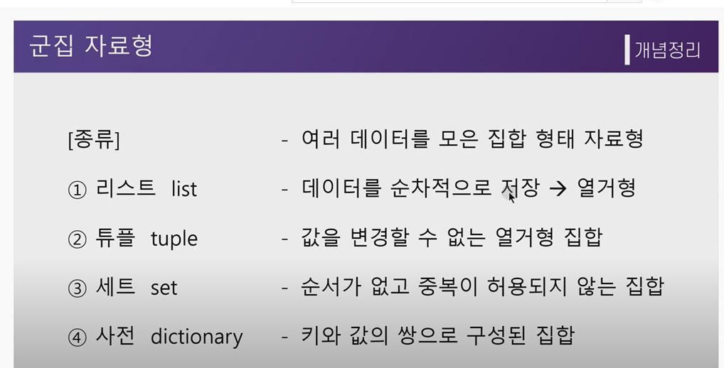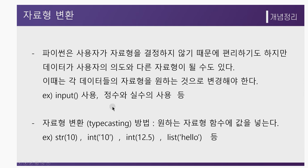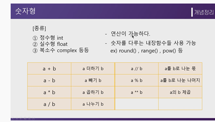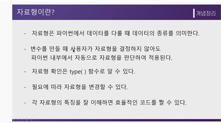 파이썬도 데이터를 효율적으로 처리하기 위해서 특징에 따라 분류한것이 자료형. 보통 다른 프로그램에서는 사용자가 지정을 하는데 변수를 만들때 사용자가 결정하는것이 아니라 파이썬 내부에서 자동으로 자료형을 판단해서 적용을 한다. 장점은 번거롭게 일일히 적어주지 않아도 된다는 점. 단점은 처음 공부를 할때에는 이 자료형등이 여러개가 있다보니 헷갈릴 수 있다. 헷갈릴때는 type()를 누르면 그 데이터가 어떤 자료형인지 확인이 가능하다.