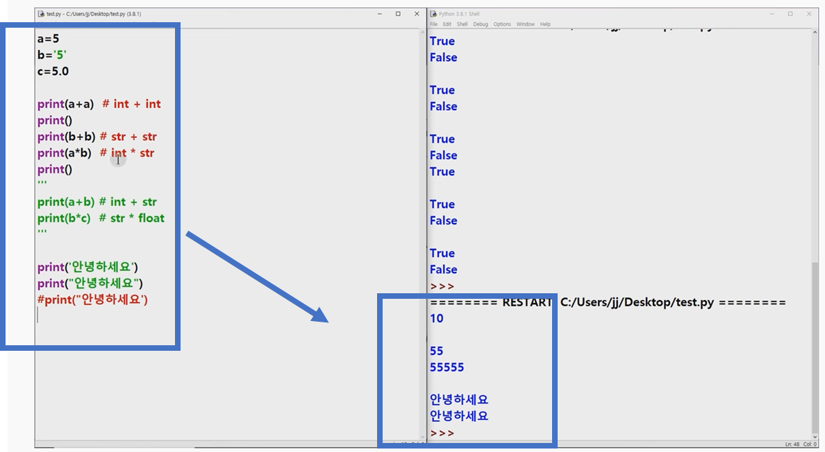 - 파이썬에서는 다른 프로그램과 달리 문자와 문자열을 구분하지 않으므로 '' 또는 '' '' 맘대로 써도 된다. ( 참고로 파이썬에서 문자를 나타낼때 '' 혹은 "" 로 쓴다. )