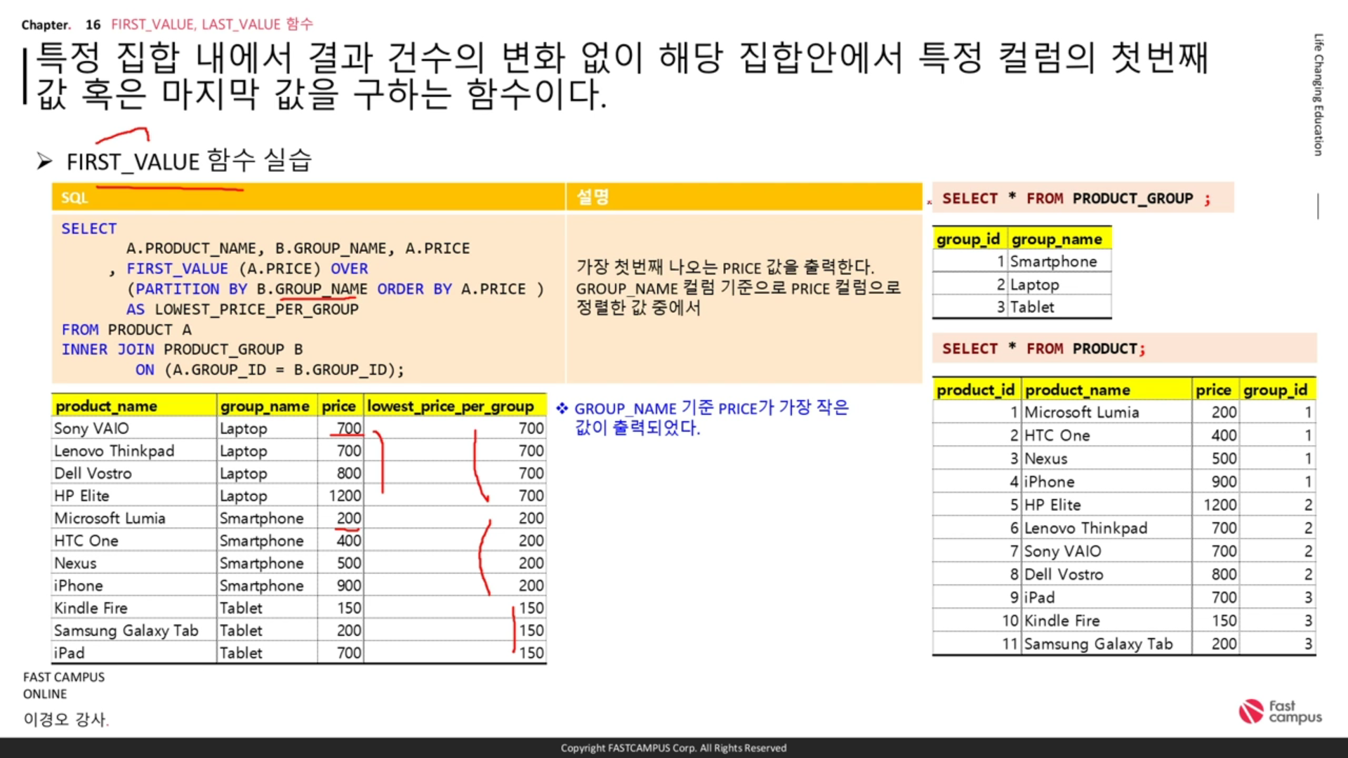 ' 그룹네임 별 프라이스에 대한 첫번째 값을 뽑겠다. ' 그룹 별 최저가.