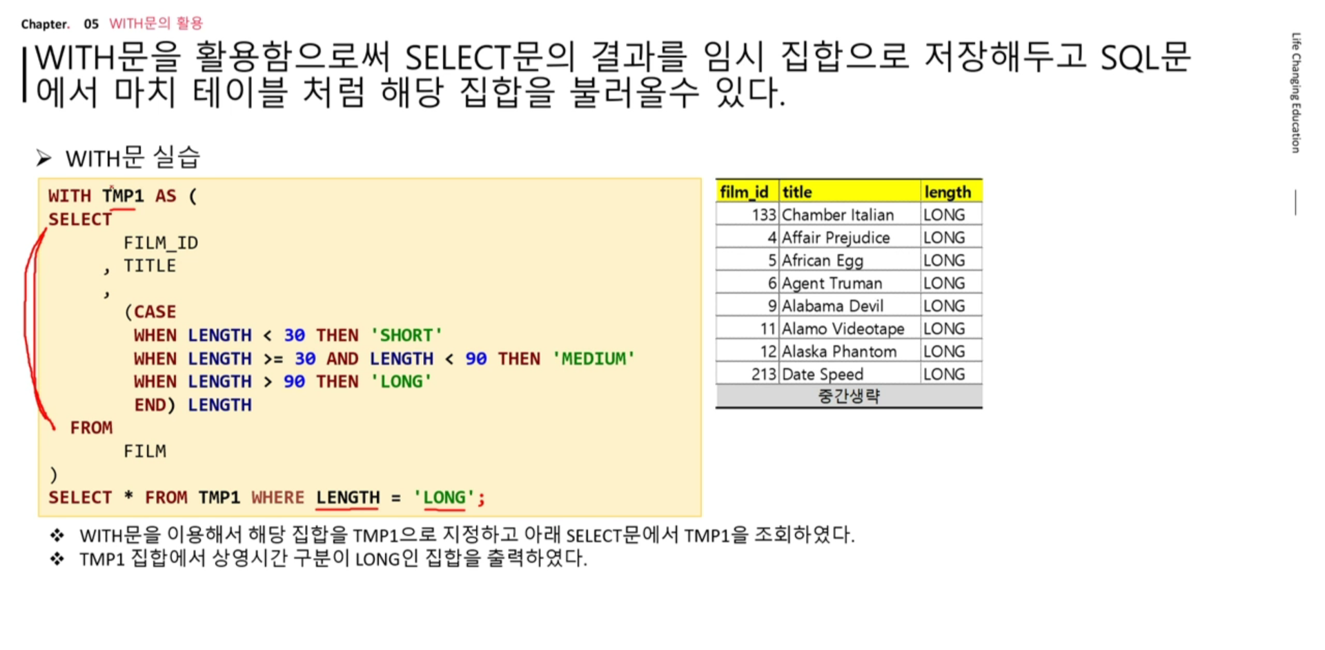우리가 얻고자 하는 집합을 얻을 수가 있다. 즉 이미 WITH 구문으로 하나의 테이블을 만들어놓고 거기서 데이터를 불러오는 것이라고 보면 됩니다. 아래의 예문을 보면 WITH구문앞에 'TMPI' 라는 테이블집합을 만들어 놓고 그다음 해당 집합에서 'LENGTH'가 LONG에 해당하는 애들을 모두 가지고 오라는 명령문입니다.