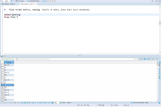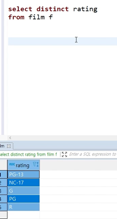 예) FILM 테이블을 활용하여, Rating 등급에 대하여 몇개의 등급이 있는지 확인해 보세요.