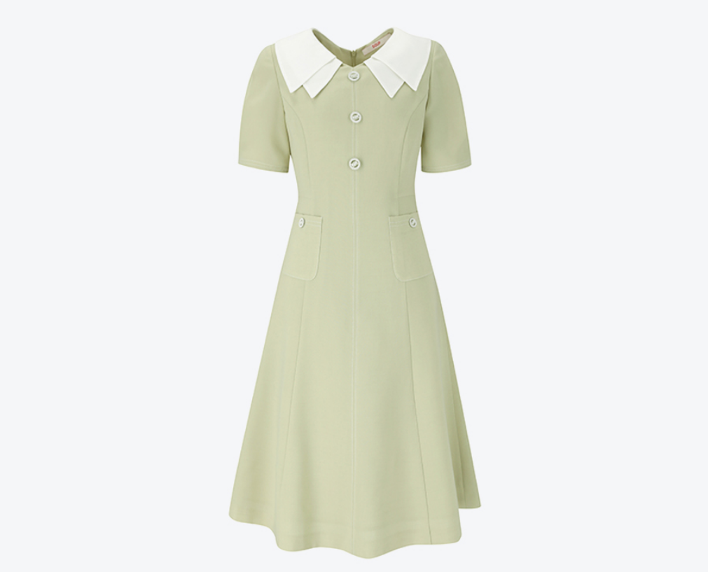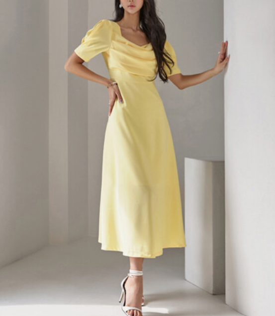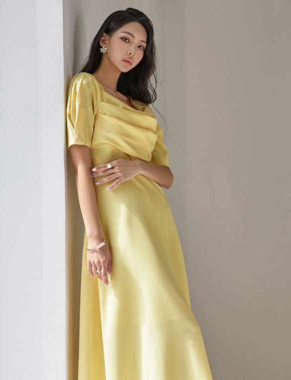 마렌 스퀘어넥 핀턱 퍼프 플레어 미디 원피스