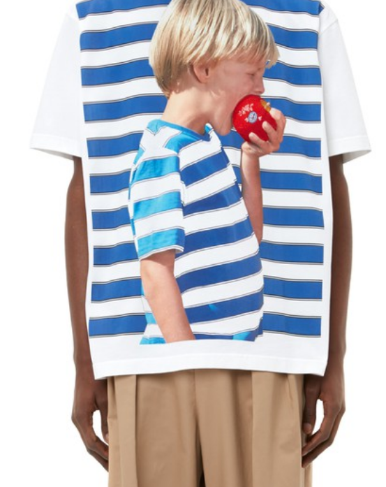 아이가 중간에 그려진 파란색 스트라이프 반팔 티셔츠가