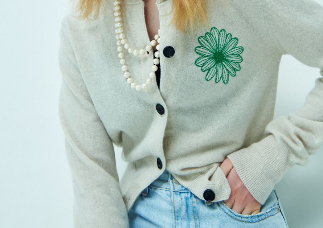 아이보리 컬러에 플라워 로고가 그려진 여자가디건은 바로 요즘 저도 너무 좋아하는 마르디메크릐 제품입니다.