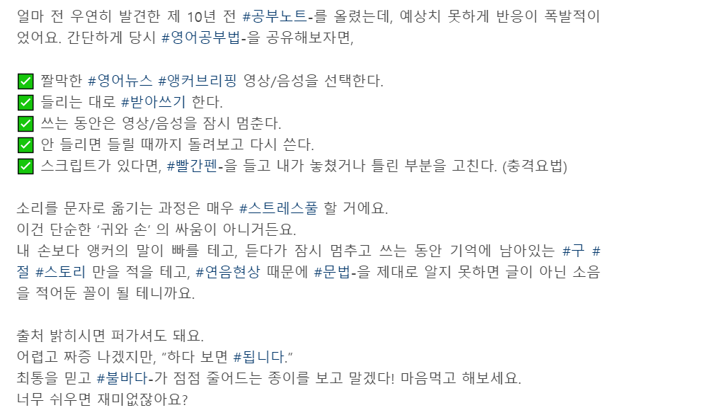 진짜 열정적인 모습에 많이 감동받게 되는데 영어공부에 대해서도 가끔 글을 남겨주신다.