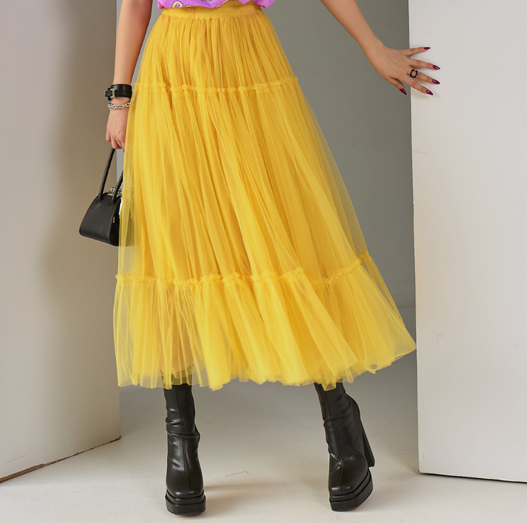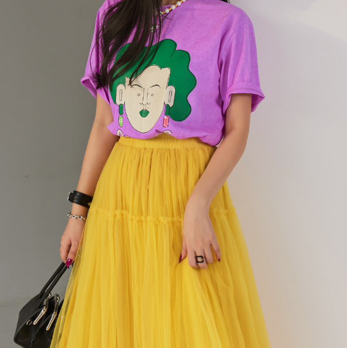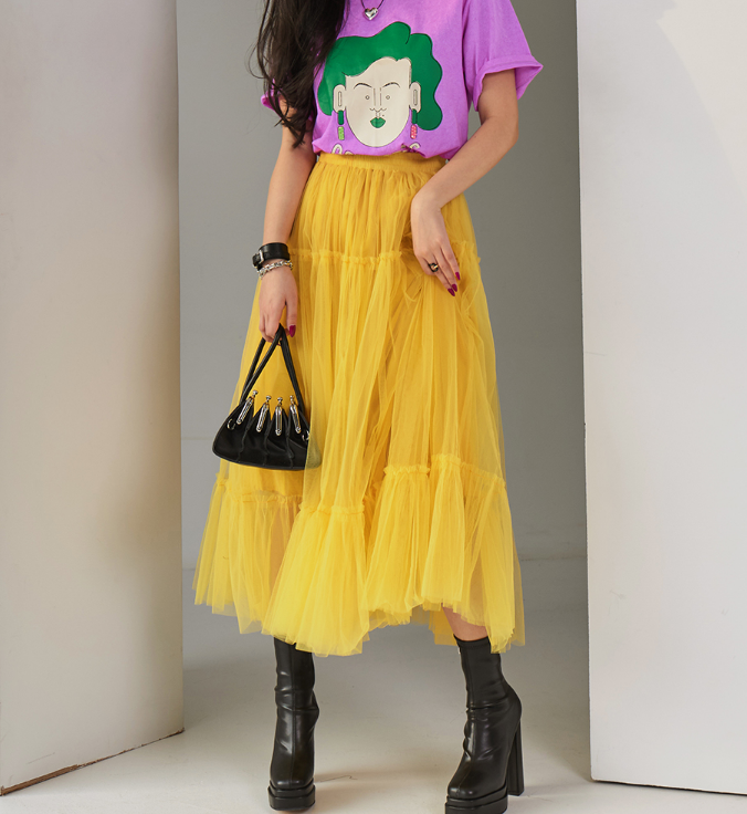 노란색, 매우 비비드해 화려한 컬러의 엘로우 여자 롱스커트를 입은 윤주희님입니다. 이 스커트는 바로 딘트 제품이에요.