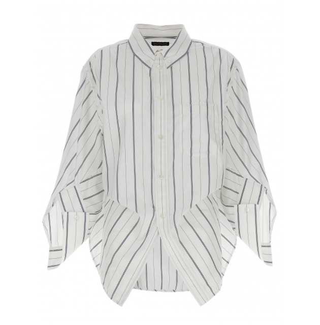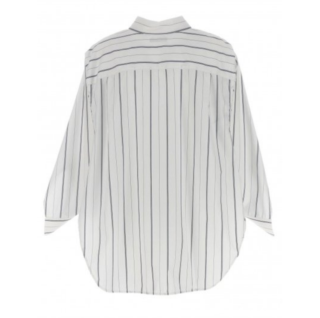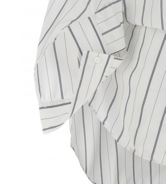 화이트 배경에 스트라이프 패턴이 깔끔한 셔츠를 입으셨습니다.
