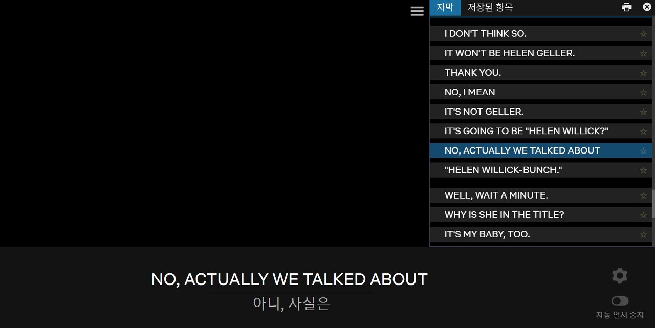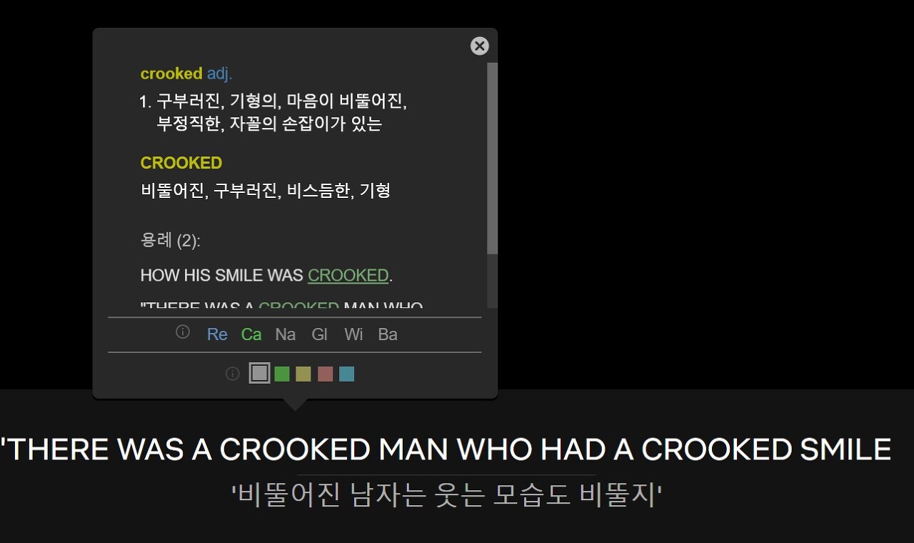 뿐만 아니라, 자막을 보다 모르는 단어가 나올경우 해당 단어를 클릭하면 이렇게 뜻이 나옵니다.