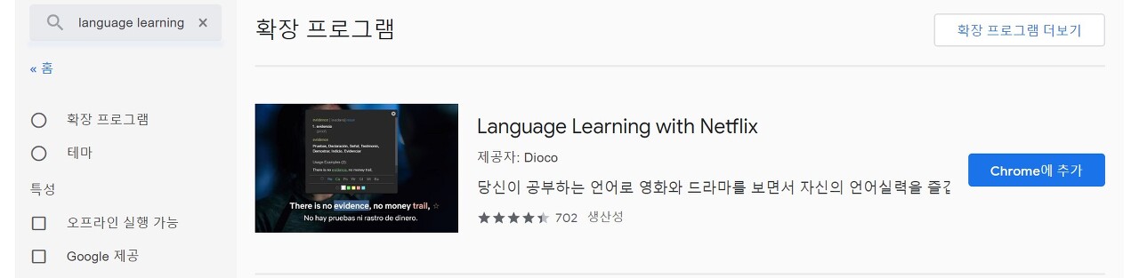 우선 저는 'Language Learning with Netflix'를 검색 후 파란색버튼의 'Chrome에 추가' 버튼을 눌러 주었습니다.