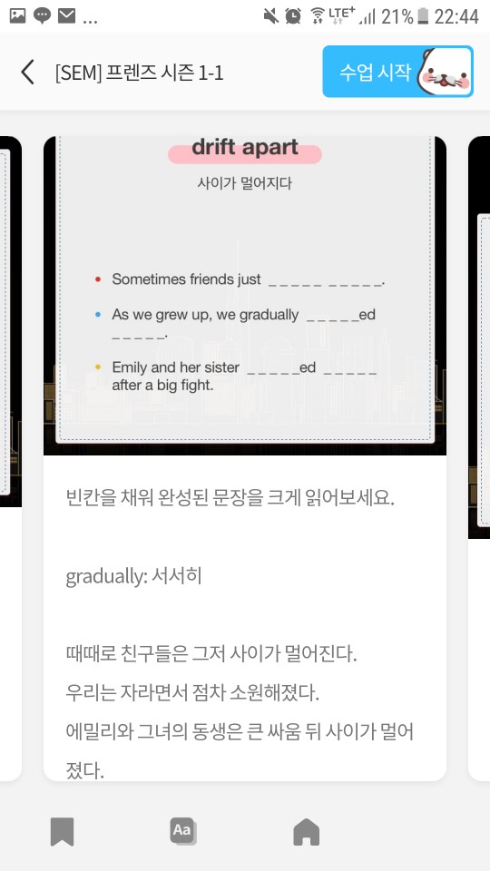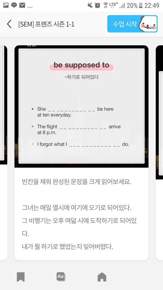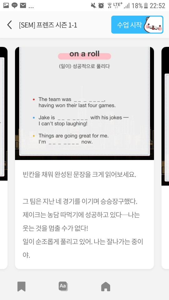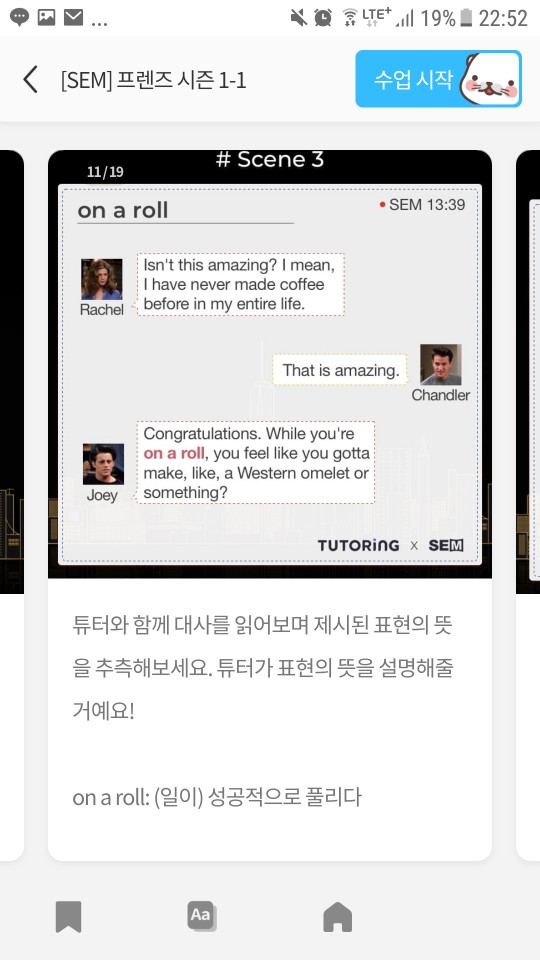 수업의 방식은 프렌즈의 한장면을 내가 먼저 문장을 읽으면 발음을 교정해 주고 이후 해당장면에 대해 내가 묘사를 하면 틀린 표현에 대해서 교정을 해 줍니다. 이후 주요표현에 대해서도 같은 방식을 진행되고 다른 예문과 함께 공부해 그 표현을 익히게 해주는 방식.