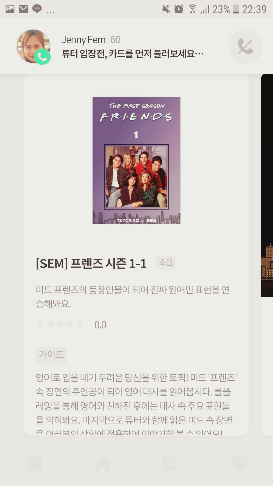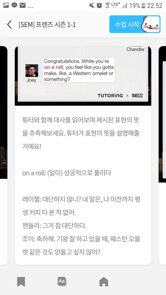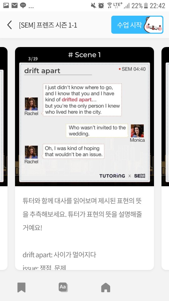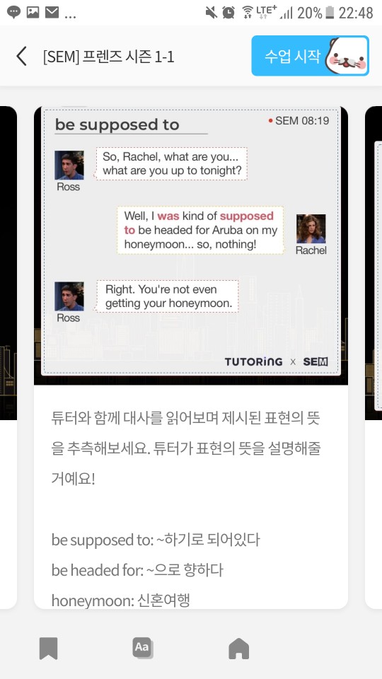 프렌즈로 공부해보니 넘 재밌어서, 튜터링으로 프렌즈를 계속 공부하면서 프리토킹을 해볼까도 생각하고 있습니다. 굳이 예약하지 않아도 매일 20분씩 영어를 혼자 공부하며 쓸 수 있다는 것은 매우 큰 장점인듯하다.